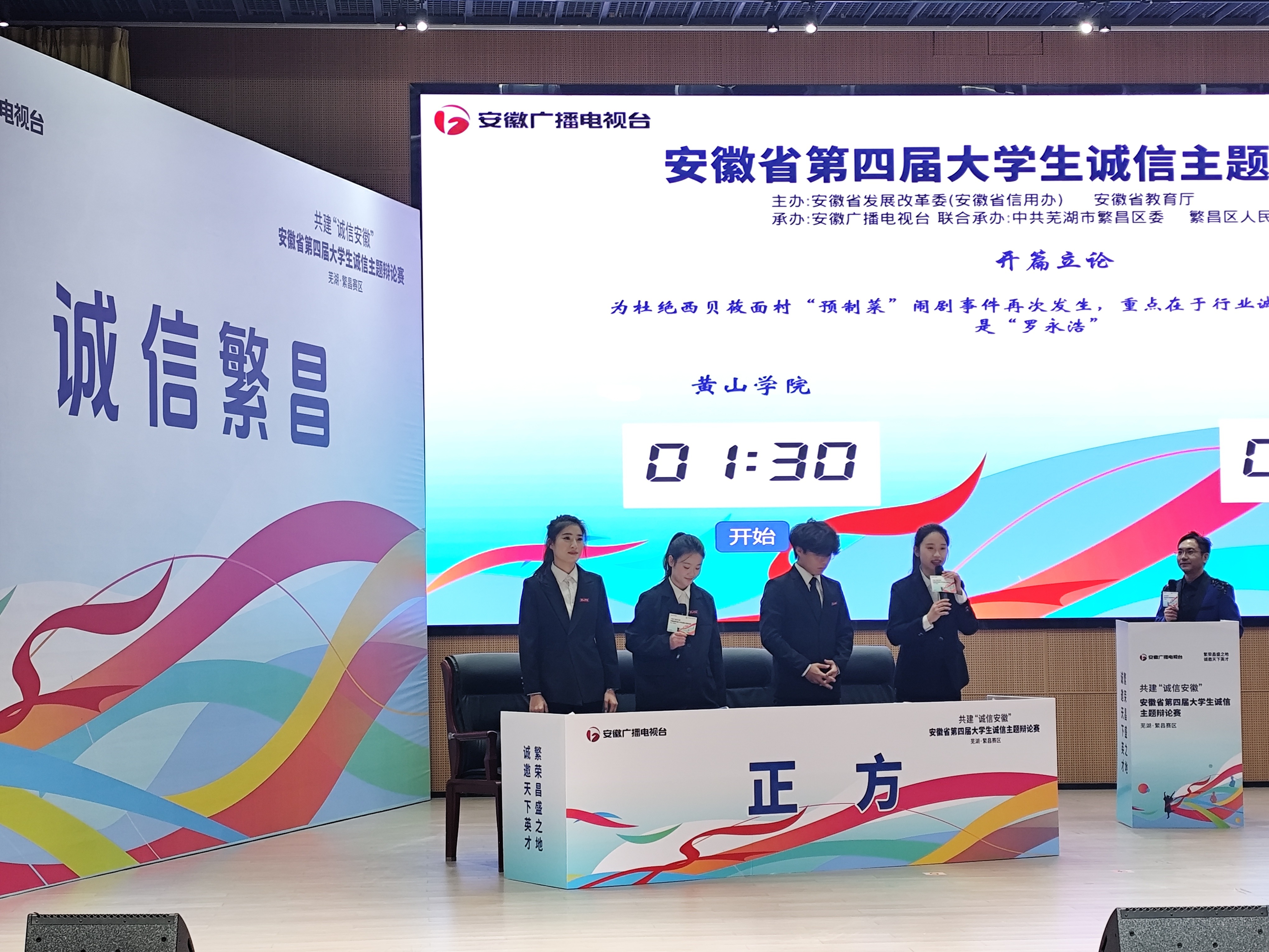 本届赛事设合肥、芜湖两大赛区,总决赛于12月14日至19日在安徽大学举行,16支高校强队展开激烈角逐。黄山学院代表队由文化与传播学院王欣雨、艺术学院李子瑞、教育科学学院李文静与吴欣悦、经济管理学院李海涛、文学院王紫淇和张怡然组成,在指导教师吴敏带领下,赛前通过精准剖析辩题、高频模拟训练打磨战术。赛场上,队员们紧扣“诚信”主题,以丰富案例破题立论,观点新颖、辩驳有力,充分展现了黄山学院学子的青春风采与专业素养。
