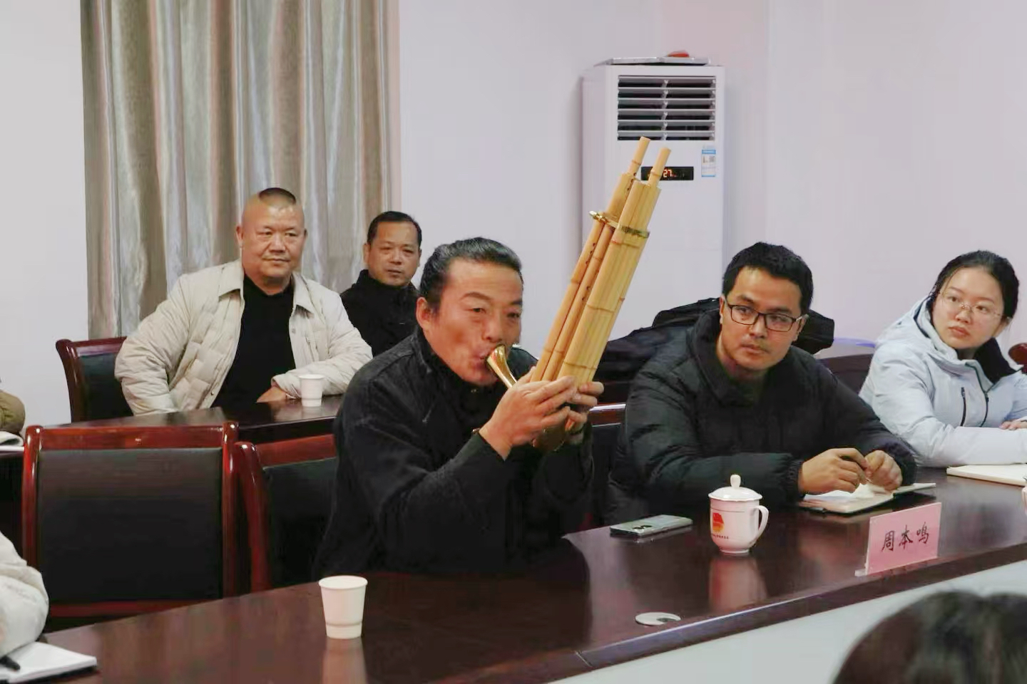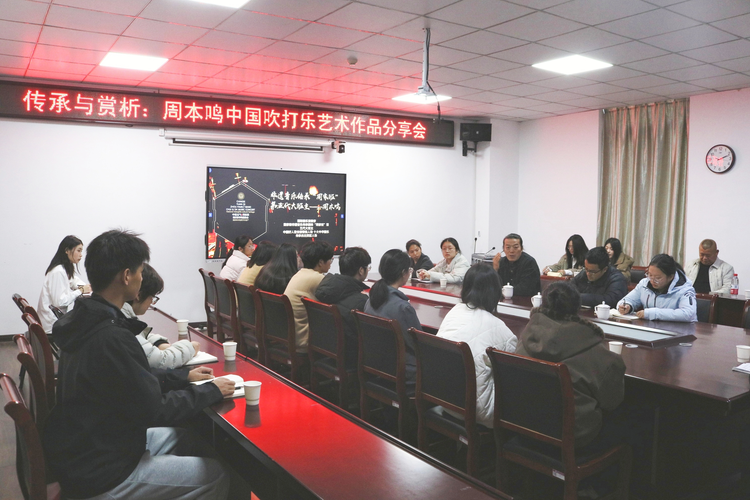 为厚植文化底蕴,提升学生艺术素养与文化自信,12月18日下午,校团委于大学生活动中心二楼会议室组织召开“完整的灵魂——中国吹打乐全乐种作品赏析”座谈会,国家级非遗灵璧菠林喇叭省级传承人周本鸣先生应邀出席,为同学们讲述文化坚守背后的故事。