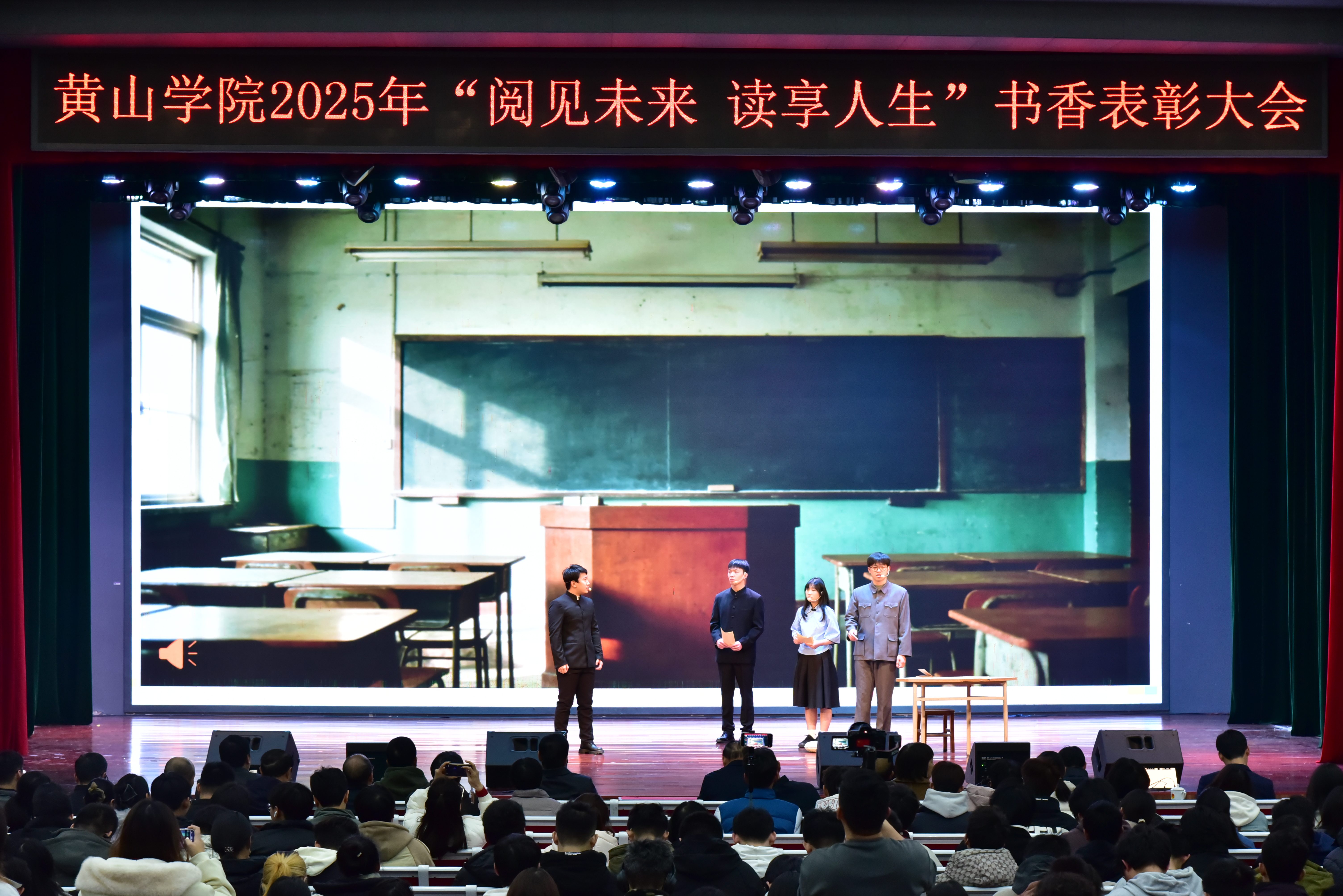 12月23日下午,我校于率水校区大学生活动中心大礼堂举办“阅见未来 读享人生”2025年校园读书主题系列活动表彰大会。校党委书记李铁范,校党委委员、组织部部长王国平出席大会,学工委成员单位负责人、各学院党组织负责人、受表彰集体和个人代表、校院两级团干部及学生代表约900余人共同参会。