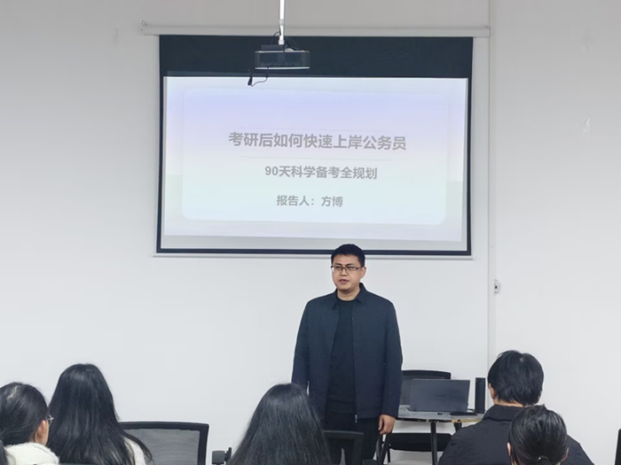 活动特邀考公领域专业导师方博主讲,聚焦“考研后90天快速上岸公务员”核心方向展开分享。方博结合自身专业背景与行业经验,针对考研后应届生的备考时间规划、大三学生考公筹备节奏等关键问题,给出了90天科学备考的系统规划,同时拆解了高效备考的实用技巧,解答了学子们在考公择校、备考方法等方面的困惑,助力大家把握考公黄金备考期,实现职业发展的顺畅衔接。