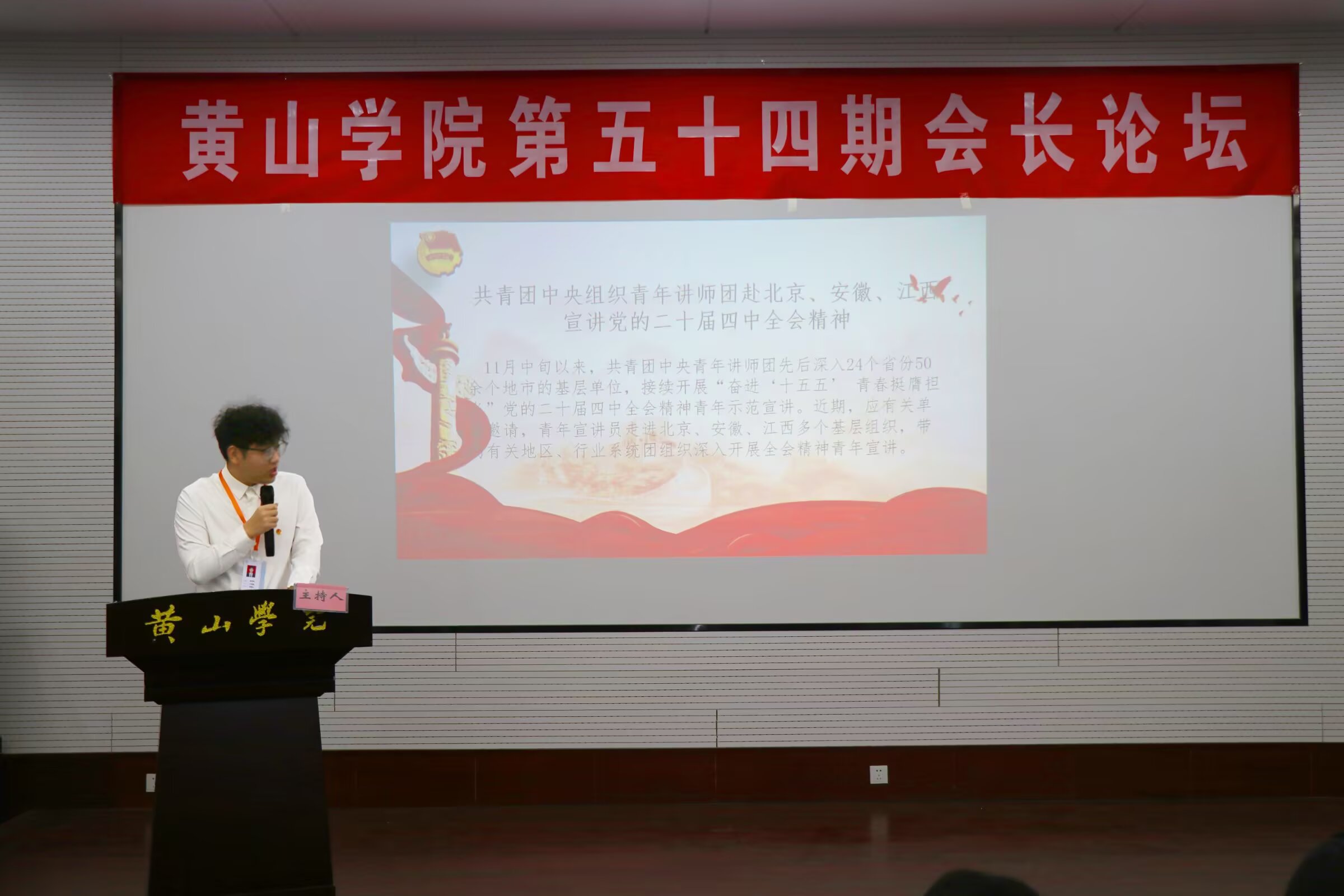 论坛上,校学生社团联合会相关工作人员依次带领全体参会人员开展学习活动,与会人员集中学习党的二十届四中全会精神相关宣讲内容,深刻领会“奋进‘十五五’ 青春挺膺担当”核心要义,夯实社团思想引领基础;随后学习《黄山学院学生社团负责人管理办法》,明确社团负责人考核与管理相关要求,规范社团日常运营管理;同时解读《黄山学院学生社团市集运营管理方案及收益分配细则》,明晰社团市集工作流程与管理规范,为相关活动开展提供制度依据。会议最后,由校团委文体科负责人作总结讲话,对我校学生社团在校园文化建设、特色活动开展等方面取得的成绩给予充分肯定,并从强化思想引领、聚焦规范建设、打造品牌特色三个方面对社团工作提出指导要求,勉励全体社团负责人凝心聚力、守正创新,不断推动我校学生社团工作高质量发展。