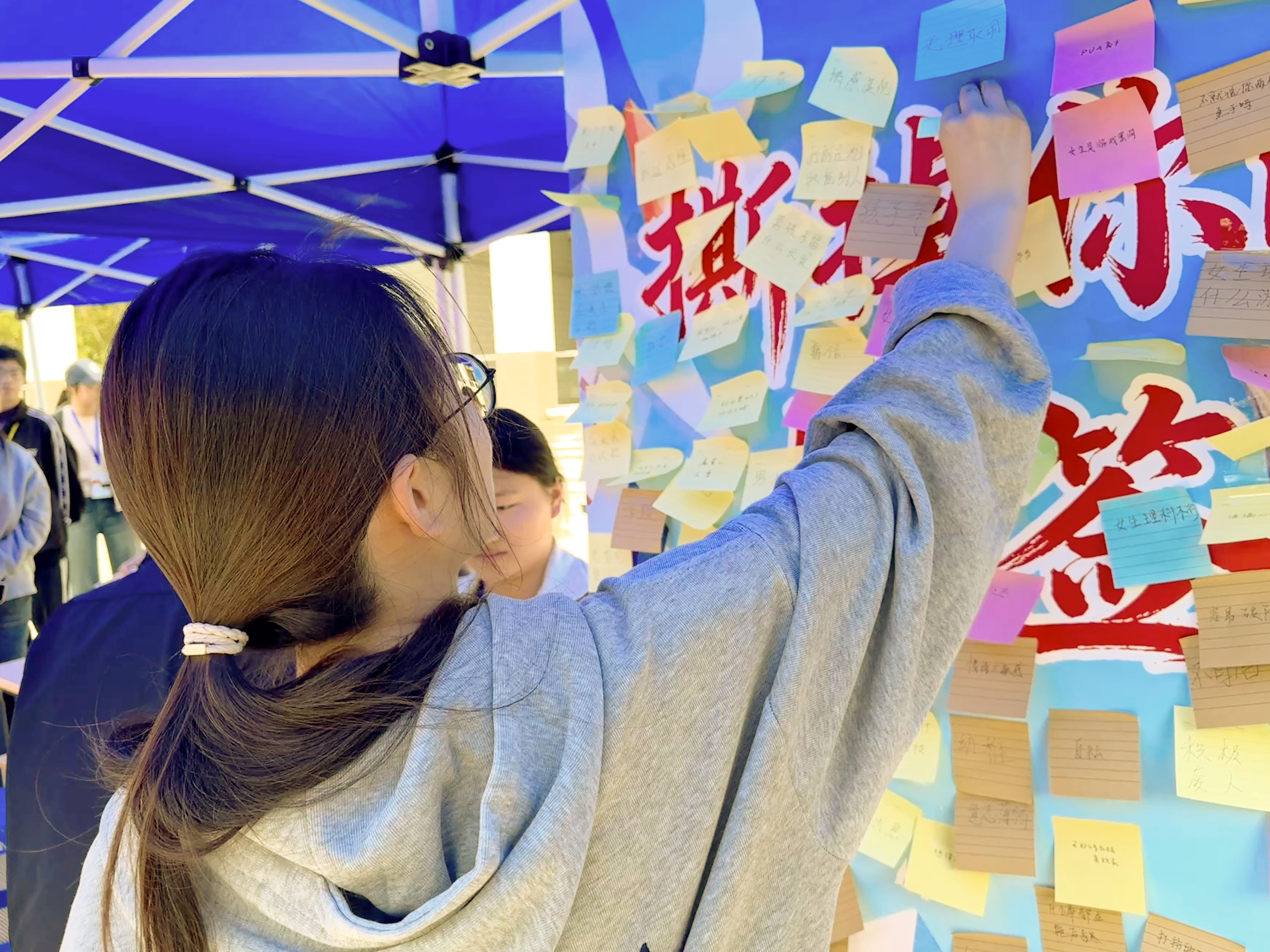 本次活动以“破除刻板印象、拒绝自我设限”为核心,精心设置“撕掉你的标签”背景板与“夸夸我自己”留言板两大互动区域。背景板上张贴的“自卑”“不够优秀”“普通”等大学生成长困惑的负面标签,成为同学们打破自我桎梏的突破口。活动现场,同学们踊跃参与,主动撕去不认同的负面标签,勇敢与刻板印象和解;在“夸夸我自己”留言板前,同学们认真书写自身优点、成长进步与美好期许,在自我肯定中筑牢自信根基,在真诚表达中实现自我悦纳。